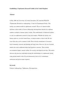 In May 2009, the University of Central Lancashire, UK, launched TRACES (Taphonomic Research in Anthropology—Centre for Experimental Study). This facility uses animal models in taphonomic research. The use of animal models facilitates wider studies of factors influencing decomposition than the low replicate numbers common to human cadaver studies. The establishment of dedicated facilities to carry out taphonomic research is long and complex. Whether the facility uses human cadavers, as in the United States, or animal models, as in the UK, the issues that arise can be common to both. These include commitment of resources, local community concerns, and planning and legal issues. However, the use of animal models also raises additional ethical and legislative concerns. These include environmental impact, animal welfare, biosecurity, and disposal activities. This article discusses the processes undertaken during the establishment of a taphonomic facility using animal models in the UK and demonstrates the level of commitment, enthusiasm, and perseverance required.
