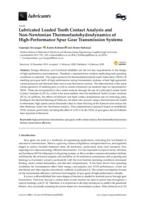 Energy efficiency and functional reliability are the two key requirements in the design of high-performance transmissions. Therefore, a representative analysis replicating real operating conditions is essential. This paper presents the thermoelastohydrodynamic lubrication (TEHL) of meshing spur gear teeth of high-performance racing transmission systems, where high generated contact pressures and lubricant shear lead to non-Newtonian traction. The determination of the input contact geometry of meshing pairs as well as contact kinematics are essential steps for representative TEHL. These are incorporated in the current analysis through the use of Lubricated Loaded Tooth Contact Analysis (LLTCA), which is far more realistic than the traditional Tooth Contact Analysis (TCA). In addition, the effects of lubricant and flash surface temperature rise of contacting pairs, leading to the thermal thinning of lubricant, are taken into account using a thermal network model. Furthermore, high-speed contact kinematics lead to shear thinning of the lubricant and reduce the film thickness under non-Newtonian traction. This comprehensive approach based on established TEHL analysis, particularly including the effect of LLTCA on the TEHL of spur gears, has not hitherto been reported in literature.