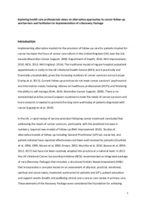 We aimed to explore health care professionals’ views of alternative strategies for follow-up care, and perceived barriers and facilitators to implementation of the Recovery Package for patients who had completed treatment for cancer. Semi-structured interviews with 19 participants sought views and experiences of key aspects of cancer care follow-up and aspects of the Recovery Package implementation.
