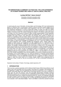 In recent years the use of Information, Communication and Technology (ICT) has transformed the delivery of healthcare within nursing practice. Research evidence and policy reviews suggest that the difficulty that some mature, female student nurses experience in the use of ICT in practice impacts their professional development. It could be argued that inability to access and utilise ICT directly impacts the sense of ‘belonging’ to the professional team and active participation in the Community of Practice in the Clinical area.