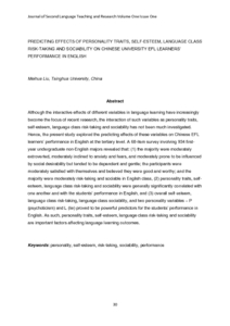 Liu, Meihua (2012) Predicting Effects of Personality Traits, Self-esteem, Language Class Risk-taking and Sociability on Chinese University EFL Learners' Performance in English. Journal of Second Language Teaching and Research, 1 (1). pp. 30-57. ISSN 2045-4031