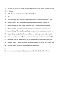 Clarkson, Beth G, Culvin, Alexandra, Pope, Stacey and Parry, Keith D. (2022) Covid-19: Reflections on threat and uncertainty for the future of elite women’s football in England. Managing Sport and Leisure, 27 (1-2). pp. 44-55. ISSN 2375-0472