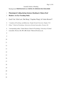 Phonological coding plays an important role in reading for hearing students. 3 Experimental findings regarding phonological coding in deaf readers are 4 controversial, and whether deaf readers are able to use phonological coding 5 remains unclear. In the current study we examined whether Chinese deaf students 6 could use phonological coding during sentence reading. Deaf middle school 7 students, chronological age-matched hearing students, and reading ability-8 matched hearing students had their eye movements recorded as they read 9 sentences containing correctly spelled characters, homophones, or unrelated 10 characters. Both hearing groups had shorter total reading times on homophones 11 than they did on unrelated characters. In contrast, no significant difference was 12 found between homophones and unrelated characters for the deaf students. 13 However, when the deaf group was divided into more-skilled and less-skilled 14 readers according to their scores on reading fluency, the homophone advantage 15 noted for the hearing controls was also observed for the more-skilled deaf 16 students.