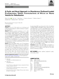 Khan, Iftikhar, Lau, Katie, Bnyan, Ruba, Houacine, Chahinez, Roberts, Matthew, Isreb, Abdullah orcid iconORCID: 0000-0001-9939-6161, Elhissi, Abdelbary and Yousaf, Sakib orcid iconORCID: 0000-0001-7010-4663 (2020) A Facile and Novel Approach to Manufacture Paclitaxel-Loaded Proliposome Tablet Formulations of Micro or Nano Vesicles for Nebulization. Pharmaceutical Research, 37 (116). ISSN 0724-8741