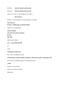Thornton, Tim orcid iconORCID: 0000-0002-0137-1554 (2020) Narrative identity and dementia. Hungarian Philosophical Review, 2020 (1). pp. 40-59.