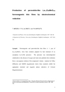 Production of perovskite-like La(1-x)Ca(x)MnO(3+delta) ferromagnetic thin films by electrochemical reduction.