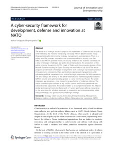 The article is of strategic nature. It projects the importance of cyber-security as policy, while reflecting the need for enhancing constantly NATO’s (North Atlantic Treaty Organization) cyber-dimensional strategy, management, and operations. There is a policy need for constant innovation and entrepreneurship in security, one that reflects also NATO’s practical needs; its security resilience and business continuity. At a time of strategic challenges and policy recommendations, the production of this article is timely. It examines NATOs Heads of States and Governments decision of the Brussels Summit meeting on Cyber Security that was held in July 2018. The article proposes a framework of strategic re-alignment, with a stronger eye toward practical innovation and entrepreneurship; practicality in operational management, while enhancing political cooperation and tactical/strategic preparation for field operations. The aim, design, and setting of this article explicitly and methodologically evaluates NATO’s security and cyber-security options to come for the near future. The article integrates and proposes a new design for a new format of collective defense. The article considers cyber-defense as key tool for current and future operational and network centric operations. The article enables us to comprehend better the Alliance’ global and regional needs the framework of current and future defense, requesting at the same time for a holistic approach to innovation and entrepreneurship, while new geostrategic and geo-economic challenges emerge.