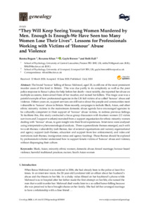 Begum, Reema, Khan, Roxanne orcid iconORCID: 0000-0002-3485-2450, Brewer, Gayle orcid iconORCID: 0000-0003-0690-4548 and Hall, Beth orcid iconORCID: 0000-0001-7143-4605 (2020) “They Will Keep Seeing Young Women Murdered by Men. Enough Is Enough-We Have Seen too Many Women Lose Their Lives”. Lessons for Professionals Working with Victims of ‘Honour’ Abuse and Violence. Genealogy, 4 (3).