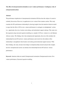 The performance implication of entrepreneurial orientation (EO) has been the subject of extensive scholarly discussions. However, its application to new venture firms remains unclear. This study examines the EO–performance relationship by drawing insights from the intention–behavior model to argue that the effect of EO on new venture performance is contingent on entrepreneurs’ actions (i.e., opportunity discovery, business networking, and institutional support seeking). This study tests this argument using structural equation modeling on a sample of 229 new ventures in a sub-Saharan African country. The findings show that entrepreneurial opportunity discovery fully mediates the relationship between EO and new venture performance and reveals how this indirect effect relationship is strengthened when business networking and institutional support increase. With these findings, the study advances knowledge in entrepreneurship research and provides insights into how entrepreneurial actions can enhance the relationship between EO and new venture performance.
