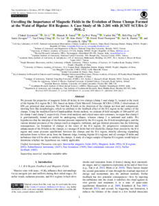 Abstract: We present the properties of magnetic fields (B fields) in two clumps (clump 1 and clump 2), located at the waist of the bipolar H ii region Sh 2-201, based on James Clerk Maxwell Telescope SCUBA-2/POL-2 observations of 850 μm polarized dust emission. We find that B fields in the direction of the clumps are bent and compressed, showing bow-like morphologies, which we attribute to the feedback effect of the H ii region on the surface of the clumps. Using the modified Davis–Chandrasekhar–Fermi method, we estimate B-field strengths of 266 and 65 μG for clump 1 and clump 2, respectively. From virial analyses and critical mass ratio estimates, we argue that clump 1 is gravitationally bound and could be undergoing collapse, whereas clump 2 is unbound and stable. We hypothesize that the interplay of the thermal pressure imparted by the H ii region, the B-field morphologies, and the various internal pressures of the clumps (such as magnetic, turbulent, and gas thermal pressures) has the following consequences: (a) formation of clumps at the waist of the H ii region; (b) progressive compression and enhancement of the B fields in the clumps; (c) stronger B fields that will shield the clumps from erosion by the H ii region and cause pressure equilibrium between the clumps and the H ii region, thereby allowing expanding ionization fronts to blow away from the filament ridge, forming bipolar H ii regions; and (d) stronger B fields and turbulence that will be able to stabilize the clumps. A study of a larger sample of bipolar H ii regions would help to determine whether our hypotheses are widely applicable.