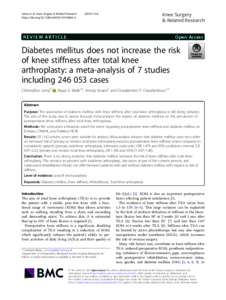 Jump, Christopher, Malik, Rayaz A., Anand, Anoop and Charalambous, Charalambos (2019) Diabetes mellitus does not increase the risk of knee stiffness after total knee arthroplasty: a meta-analysis of 7 studies including 246 053 cases. Knee Surgery & Related Research, 31 (1). p. 6. ISSN 2234-0726