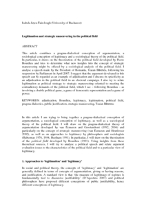 This article combines a pragma-dialectical conception of argumentation, a sociological conception of legitimacy and a sociological theory of the political field. In particular, it draws on the theorization of the political field developed by Pierre Bourdieu and tries to determine what new insights into the concept of strategic maneuvering might be offered by a sociological analysis of the political field. I analyze a speech made by the President of Romania, Traian Băsescu, following his suspension by Parliament in April 2007. I suggest that the argument developed in this speech can be regarded as an example of adjudication and I discuss its specificity as an adjudication in the political field in an electoral campaign. I also try to relate legitimation as political strategy to strategic maneuvering oriented to meeting the contradictory demands of the political field, which I see—following Bourdieu—as involving a double political game, a game of democratic representation and a game of power.