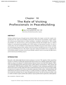 Seeking to inform the peace-through-tourism scholarly debate, this chapter revisits this complex relationship from the angle of peacebuilding professionals. International peacebuilding settings habitually welcome peace professionals as visiting contributors, consultants, and freelancers. These visiting peacebuilders are characterised by a form of geographical hybridity that identifies them as a distinct audience in international peacebuilding and a niche audience of international travellers. In order to examine their role and contribution in international peacebuilding, the present study employs a qualitative methodological approach that combines historical narrative and field interviews to the case of the Cyprus peacebuilding discourse. This chapter argues that visiting peacebuilders have a significant role in formulating optimal encounters between peacebuilder audiences and in increasing the effectiveness of international peacebuilding projects.