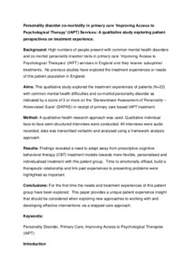 Personality disorder co-morbidity in primary care ‘Improving Access to Psychological Therapy’ (IAPT) services: a qualitative study exploring patient perspectives on treatment experience.