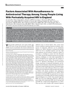 Judd, A, Melvin, D, Thompson, L. C, Foster, C, Le Prevost, M, Evangeli, M, Winston, A, Arenas-Pinto, A, Sturgeon, K et al (2020) Factors Associated With Nonadherence to Antiretroviral Therapy Among Young People Living With Perinatally Acquired HIV in England. Journal of the Association of Nurses in AIDS Care, 31 (5). pp. 574-586. ISSN 1055-3290