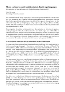 Taken together the articles in this special issues draw attention to that diversity: perhaps contrary to popular belief, SL practices across the Asia-Pacific region can, and do differ in remarkable ways that strengthen our understanding of language variation. To that end, I begin by highlighting the distinctive sociolinguistic settings and practices covered by this special issue. This is followed by a discussion of macro- and micro-social variation, why this theme is so relevant for SL variation studies, and how it is taken up by the papers that follow.