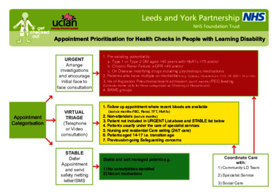 Due to measures in place in relation to managing COVID-19 pandemic, the Learning Disability health checks in their old form are a problem to implement and are not being done. Working with colleagues through the Royal College of General Practitioners Special Interest Groups and clinicians across the UK, guidelines on how to prioritise health checks were developed and adopted by Leeds CCG and NHS England