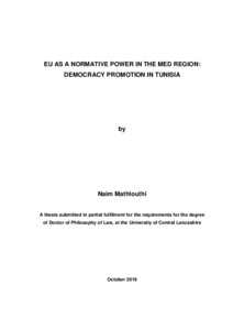 Mathlouthi, Naim (2019) EU AS A NORMATIVE POWER IN THE MED REGION: DEMOCRACY PROMOTION IN TUNISIA. Doctoral thesis, University of Central Lancashire.