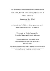 Day, Adrienne (2020) The physiological and biomechanical effects of a short term, 8-week, eBike cycling intervention in stroke survivors. Masters thesis, University of Central Lancashire.