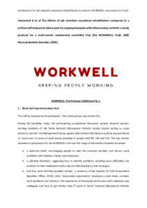 Abstract: Background: Work problems are common in people with inflammatory arthritis. Up to 50% stop work within 10 years due to their condition and up to 67% report presenteeism (i.e. reduced work productivity), even amongst those with low disease activity. Job retention vocational rehabilitation (JRVR) may help prevent or postpone job loss and reduce presenteeism through work assessment, work-related rehabilitation and enabling job accommodations. This aims to create a better match between the person’s abilities and their job demands. The objectives of the Workwell trial are to test the overall effectiveness and cost-effectiveness of JRVR (WORKWELL) provided by additionally trained National Health Service (NHS) occupational therapists compared to a control group who receive self-help information both in addition to usual care. Methods: Based on the learning from a feasibility trial (the WORK-IA trial: ISRCTN76777720), the WORKWELL trial is a multi-centre, pragmatic, individually-randomised parallel group superiority trial, including economic evaluation, contextual factors analysis and process evaluation. Two hundred forty employed adults with rheumatoid arthritis, undifferentiated inflammatory arthritis or psoriatic arthritis (in secondary care), aged 18 years or older with work instability will be randomised to one of two groups: a self-help written work advice pack plus usual care (control intervention); or WORKWELL JRVR plus a self-help written work advice pack and usual care. WORKWELL will be delivered by occupational therapists provided with additional JRVR training from the research team. The primary outcome is presenteeism as measured using the Work Limitations Questionnaire-25. A comprehensive range of secondary outcomes of work, health, contextual factors and health resource use are included. Outcomes are measured at 6- and 12- months (with 12-months as the primary end-point). A multi-perspective within-trial cost-effectiveness analyses will also be conducted. Discussion: This trial will contribute to the evidence base for provision of JRVR to people with inflammatory arthritis. If JRVR is found to be effective in enabling people to keep working, the findings will support decision-making about provision of JRVR by rheumatology teams, therapy services and healthcare commissioners, and providing evidence of the effectiveness of JRVR and the economic impact of its implementation. Trial registration: Clinical Trials.Gov: NCT03942783. Registered 08/05/2019 (https://clinicaltrials.gov/ct2/show/NCT03942783); ISRCTN Registry: ISRCTN61762297. Registered:13/05/2019 (http://www.isrctn.com/ISRCTN61762297). Retrospectively registered.
