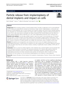 Abstract: Background: With increasing numbers of dental implants placed annually, complications such as peri-implantitis and the subsequent periprosthetic osteolysis are becoming a major concern. Implantoplasty, a commonly used treatment of peri-implantitis, aims to remove plaque from exposed implants and reduce future microbial adhesion and colonisation by mechanically modifying the implant surface topography, delaying re-infection/colonisation of the site. This in vitro study aims to investigate the release of particles from dental implants and their effects on human gingival fibroblasts (HGFs), following an in vitro mock implantoplasty procedure with a diamond burr. Materials and methods: Commercially available implants made from grade 4 (commercially pure, CP) titanium (G4) and grade 5 Ti-6Al-4 V titanium (G5) alloy implants were investigated. Implant particle compositions were quantified by inductively coupled plasma optical emission spectrometer (ICP-OES) following acid digestion. HGFs were cultured in presence of implant particles, and viability was determined using a metabolic activity assay. Results: Microparticles and nanoparticles were released from both G4 and G5 implants following the mock implantoplasty procedure. A small amount of vanadium ions were released from G5 particles following immersion in both simulated body fluid and cell culture medium, resulting in significantly reduced viability of HGFs after 10 days of culture. Conclusion: There is a need for careful evaluation of the materials used in dental implants and the potential risks of the individual constituents of any alloy. The potential cytotoxicity of G5 titanium alloy particles should be considered when choosing a device for dental implants. Additionally, regardless of implant material, the implantoplasty procedure can release nanometre-sized particles, the full systemic effect of which is not fully understood. As such, authors do not recommend implantoplasty for the treatment of peri-implantitis.
