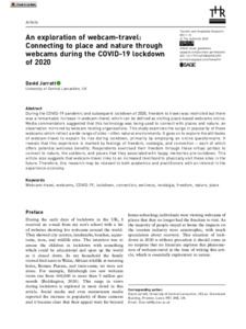 An exploration of webcam-travel: connecting to place and nature through webcams during the COVID-19 lockdown of 2020.