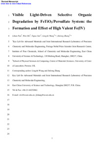 The role of high-valent Fe has rarely been explored in persulfate-based heterogeneous reaction. Herein, the existence of Fe(IV) is verified in a visible light-assisted FeTiO3/persulfate system using methyl phenyl sulfoxide as the probe. The FeTiO3/persulfate/light system is capable of selectively degrading aromatic compounds with a higher ionization potential including tetracycline and bisphenol A by photo-generated high-valent Fe(IV). The contributions from SO· 4, ·OH and 1O2 are excluded. The comparable efficiency in the dark requires higher dosages and suffers from a rapid deactivation. Based on