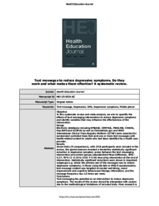 Cox, Katherine L., Allida, Sabine M. and Hackett, Maree orcid iconORCID: 0000-0003-1211-9087 (2020) Text messages to reduce depressive symptoms: Do they work and what makes them effective? A systematic review. Health Education Journal, 80 (3). pp. 253-271. ISSN 0017-8969
