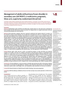 Rangan, Amar, Brealey, Stephen D, Keding, Ada, Corbacho, Belen, Northgraves, Matthew, Kottam, Lucksy, Goodchild, Lorna, Srikesavan, Cynthia, Rex, Saleema et al (2020) Management of adults with primary frozen shoulder in secondary care (UK FROST): a multicentre, pragmatic, three-arm, superiority randomised clinical trial. The Lancet, 396 (10256). pp. 977-989. ISSN 0140-6736