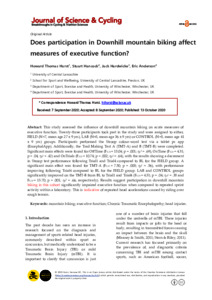 This study assessed the influence of downhill mountain biking on acute measures of executive function. Twenty-three participants took part in the study and were assigned to either, FIELD (N=7, mean age 27 ± 9 yrs), LAB (N=8, mean age 36 ± 9 yrs) or CONTROL (N=8, mean age 41 ± 9 yrs) groups. Participants performed the Stroop colour-word test via a tablet pc app (EncephalApp). Additionally, the Trail Making Test A (TMT-A) and B (TMT-B) were completed. Significant main effects were found for OffTime (F2,12 = 13.04; p = .001; ηp2 = .69), OnTime (F2,12 = 4.31; p = .04; ηp2 = .42) and OnTrials (F2,12 = 10.74; p = .002; ηp2 = .64), with the results showing a decrement in Stroop test performance following Trial1 and Trial4 compared to BL for the FIELD group. A significant main effect was found for TMT-A (F2,12 = 7.50; p = .008; ηp2 = .56), with performance improving following Trial4 compared to BL for the FIELD group. LAB and CONTROL groups significantly improved on the TMT-B from BL to Trial1 and Trial4 (F2,14 = 4.31; p = .04; ηp2 = .38 and F2,14 = 13.70; p = .001; ηp2 = .66, respectively). Results suggest participation in downhill mountain biking in this cohort significantly impaired executive function when compared to repeated sprint activity within a laboratory. This is indicative of repeated head accelerations caused by riding over rough terrain.