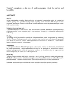 Amidst the COVID-19 outbreak, service organizations rushed to deploy robots to serve people in quarantine, again igniting the ongoing dispute regarding robots in tourism. This study aims to investigate tourists’ perceptions regarding the use of robots and, more specifically, anthropomorphic robots in the tourism domain.