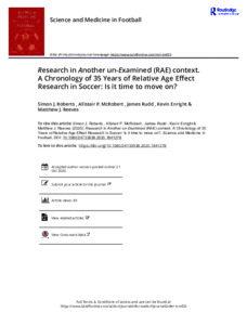 Roberts, Simon J., McRobert, Allistair P., Rudd, James, Enright, Kevin and Reeves, Matthew orcid iconORCID: 0000-0002-3903-2910 (2021) Research in Another un-Examined (RAE) context. A Chronology of 35 Years of Relative Age Effect Research in Soccer: Is it time to move on? Science and Medicine in Football, 5 (4). pp. 301-309. ISSN 2473-3938