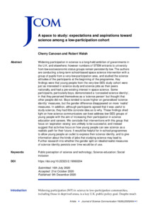 Widening participation in science is a long-held ambition of governments in the UK and elsewhere; however numbers of STEM entrants to university from low-socioeconomic status groups remain persistently low. The authors are conducting a long-term school-based space science intervention with a group of pupils from a very-low-participation area, and studied the science attitudes of the participants at the beginning of the programme. Key findings were that young people from the very-low-SES study cohort were just as interested in science study and science jobs as their peers nationally, and had a pre-existing interest in space science. Some participants, particularly boys, demonstrated a ‘concealed science identity’, in that they perceived themselves as a ‘science person’ but thought that other people did not. Boys tended to score higher on generalised ‘science identity’ measures, but the gender difference disappeared on more ‘realist’ measures. In addition, although participants agreed that it was useful to study science, they had little concrete idea as to why. These findings shed light on how science communicators can best address low-SES groups of young people with the aim of increasing their participation in science education and careers. We conclude that interventions with this group that focus on ‘aspiration raising’ are unlikely to be successful, and instead suggest that activities focus on how young people can see science as a realistic path for their future. It would be helpful for in-school programmes to allow young people an outlet to express their science identity, and to give information about the kinds of jobs that studying science may lead to. Further research into whether the gender split on idealist/realist measures of science identity persists over time would be of use.