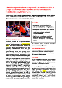 Background Exercise is seen as an effective intervention to combat the reduction in postural stability and increased chance of falls in Parkinson's patients. However, there is some debate as to where this exercise should take place. This article critically appraises and evaluates a systematic review looking at home-based exercise versus centre-based exercise for improving balance and functional outcomes.