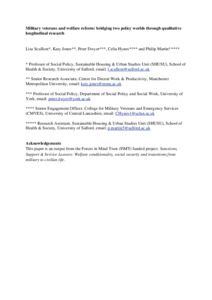 Scullion, Lisa, Jones, Katy, Dwyer, Peter, Hynes, Celia and Martin, Philip (2021) Military veterans and welfare reform: bridging two policy worlds through qualitative longitudinal research. Social Policy and Society . ISSN 1474-7464