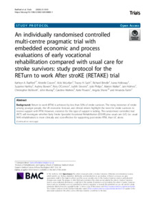 Radford, Kathryn, King, Kristelle, McLellan, Vicki, Sach, Tracey, Brindle, Richard, Holloway, Ivana, Hartley, Suzanne, Bowen, Audrey, O'Connor, Rory et al (2020) An individually randomised controlled multi-centre pragmatic trial with embedded economic and process evaluations of early vocational rehabilitation compared with usual care for stroke survivors: study protocol for the RETurn to work After stroKE (RETAKE) trial. Trials, 21 (1010).