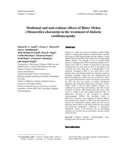 Smail, Manal M. A., Howarth, Frank. C., Abdulkhalek, Samar, Ismail, Abla Mohamed, Singh, Ram B., Hanoman, Carlin, Rupee, Khemraj, Rupee, Sunil, Cummings, Emanuel et al (2020) Medicinal and anti-oxidant effects of Bitter Melon (Momordica charantia) in the treatment of diabetic cardiomyopathy. World Heart Journal, 12 (3). ISSN 1556-4002