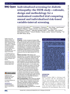 Broadbent, Deborah M, Sampson, Christopher J, Wang, Amu, Howard, Lola, Williams, Abigail E, Howlin, Susan U, Appelbe, Duncan, Moitt, Tracy, Cheyne, Christopher P et al (2019) Individualised screening for diabetic retinopathy: the ISDR study—rationale, design and methodology for a randomised controlled trial comparing annual and individualised risk-based variable-interval screening. BMJ Open, 9 (6). e025788.