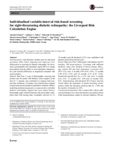 Eleuteri, Antonio, Fisher, Anthony C., Broadbent, Deborah M., García-Fiñana, Marta, Cheyne, Christopher P., Wang, Amu, Stratton, Irene M., Gabbay, Mark, Seddon, Daniel et al (2017) Individualised variable-interval risk-based screening for sight-threatening diabetic retinopathy: the Liverpool Risk Calculation Engine. Diabetologia, 60 (11). pp. 2174-2182. ISSN 0012-186X