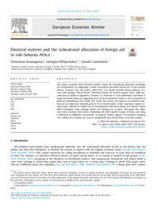 Anaxagorou, Christiana orcid iconORCID: 0000-0002-1720-9551, Efthyvoulou, Georgios and Sarantides, Vassilis (2020) Electoral motives and the subnational allocation of foreign aid in sub-Saharan Africa. European Economic Review, 127 . p. 103430. ISSN 0014-2921
