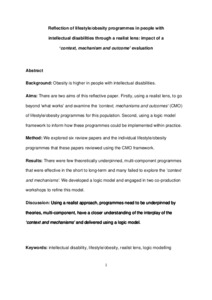 There are two aims of this explorative paper. Firstly, using a realist lens, to go beyond ‘what works’ and examine the ‘context, mechanisms and outcomes’ (CMO) of lifestyle/obesity programmes for this population. Second, using a logic model framework to inform how these programmes could be implemented within practice.