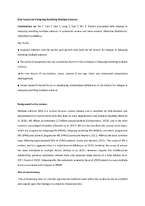 Relapsing remitting is the most common type of multiple sclerosis, affecting approximately 85% of all patients. Previous evidence has suggested that the risk factors for developing relapsing remitting multiple sclerosis is multifactorial. Similarly, it has been suggested that these factors also influence the risk of relapse. This article critically appraises and evaluates a systematic review that examined multiple factors associated with the risk of relapse for relapsing remitting multiple sclerosis.
