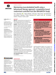 Macfarlane, Gary J, Beasley, Marcus, Scott, Neil, Chong, Huey, McNamee, Paul, McBeth, John, Basu, Neil, Hannaford, Philip C, Jones, Gareth T et al (2021) Maintaining musculoskeletal health using a behavioural therapy approach: a population-based randomised controlled trial (the MAmMOTH Study). Annals of the Rheumatic Diseases . ISSN 0003-4967