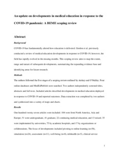 COVID-19 has fundamentally altered how education is delivered. Gordon et al. previously conducted a review of medical education developments in response to COVID-19; however, the field has rapidly evolved in the ensuing months. This scoping review aims to map the extent, range and nature of subsequent developments, summarizing the expanding evidence base and identifying areas for future research.