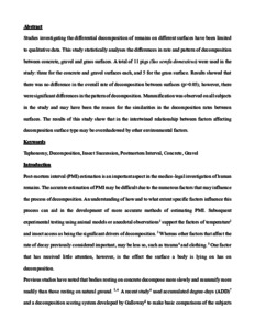 Studies investigating the differential decomposition of remains on different surfaces have been limited to qualitative data. This study statistically analyses the differences in rate and pattern of decomposition between concrete, gravel and grass surfaces. A total of 11 pigs (Sus scrofa domesticus) were used in the study: three for the concrete and gravel surfaces each, and 5 for the grass surface. Results showed that there was no difference in the overall rate of decomposition between surfaces (p > 0.05); however, there were significant differences in the pattern of decomposition. Mummification was observed on all subjects in the study and may have been the reason for the similarities in the decomposition rates between surfaces. The results of this study show that in the intertwined relationship between factors affecting decomposition surface type may be overshadowed by other environmental factors.