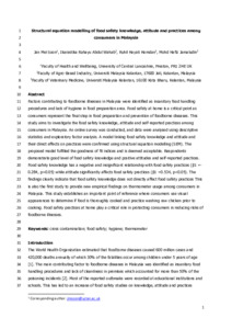 Factors contributing to foodborne illnesses in Malaysia were identified as insanitary food handling procedures and lack of hygiene in food preparation area. Food safety at home is a critical point as consumers represent the final step in food preparation and prevention of foodborne diseases. This study aims to investigate the food safety knowledge, attitude and self-reported practices among consumers in Malaysia. An online survey was conducted, and data were analysed using descriptive statistics and exploratory factor analysis. A model linking food safety knowledge and attitude and their direct effects on practices were confirmed using structural equation modelling (SEM). The proposed model fulfilled the goodness of fit indices and is deemed acceptable. Respondents demonstrate good level of food safety knowledge and positive attitudes and self-reported practices. Food safety knowledge has a negative and insignificant relationship with food safety practices (β1 =- 0.284, p>0.05) while attitude significantly affects food safety practices (β1 =0.534, p<0.05). The findings clearly indicate that food safety knowledge does not directly affect food safety practices This is also the first study to provide new empirical findings on thermometer usage among consumers in Malaysia. This study establishes an important point of reference where consumers use visual appearances to determine if food is thoroughly cooked and practice washing raw chicken prior to cooking. Food safety practices at home play a critical role in protecting consumers in reducing risks of foodborne illnesses.