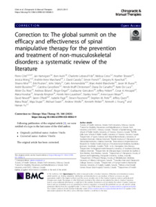 Côté, Pierre, Hartvigsen, Jan, Axén, Iben, Leboeuf-Yde, Charlotte, Corso, Melissa, Shearer, Heather, Wong, Jessica, Marchand, Andrée-Anne, Cassidy, J. David et al (2021) Correction to: The global summit on the efficacy and effectiveness of spinal manipulative therapy for the prevention and treatment of non-musculoskeletal disorders: a systematic review of the literature. Chiropractic & Manual Therapies, 29 (1). p. 11. ISSN 2045-709X