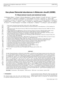 Rodríguez-Baras, M., Fuente, A., Riviére-Marichalar, P., Navarro-Almaida, D., Caselli, P., Gerin, M., Kramer, C., Kirk, Jason Matthew orcid iconORCID: 0000-0002-4552-7477 and Ward-Thompson, Derek orcid iconORCID: 0000-0003-1140-2761 (2021) Gas phase Elemental abundances in Molecular cloudS (GEMS). IV. Observational results and statistical trends. Astronomy & Astrophysics . ISSN 0004-6361