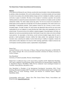 In this article we will discuss the use of drones, as well as the visual simulation of drone afforded aesthetics, by activists, artists and protesters. We use the existing literature of surveillance studies and visual studies to examine how exactly a drone-afforded visibility emerges and how it mediates the visibility of a particular community or space of contention. We draw on the concepts of “surveillance capacities” and (counter) visibility practices to analyse the process and production of drone (and drone-simulated) counter surveillant artist/activist visibility. The article makes several key points. The first one concerns the construction of protest space and the protest site volumetrically from the airborne perspective of the citizen drone via an assemblage of artist/activist practices. These practices include the use of drones, as well as drone-simulated imagery. The latter includes, DIY aerial camera rigs attached to kites and the use visual social media platforms such as Instagram to curate otherwise less visible military drone geographies more ‘real’ and proximate. The second concerns the visibility of subjects engaged in the protest space. And finally, we elaborate how events are presented dynamically (rhythmically) through drone videos and a drone-afforded visual grammar. Our assumption is that drones, as well as drone-simulated imagery allow the user to generate a hybrid participative (inclusive) visibility that makes protest more spectacular through its volumetric vision, subverting the visibility of control while striving for visibility of recognition. Overall, this article seeks to further elaborate on the visual turn within sociology, specifically in relation to what are now commonplace volumetric practices of power, representation and participation.