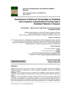 Boston, Cecil, Kurup, Rajini, Hadi, Ss orcid iconORCID: 0000-0002-2994-3083, Cummings, Emanuel and O'hara, Adrian orcid iconORCID: 0000-0003-1837-680X (2021) Assessment of Self-care Knowledge on Diabetes and Long-term Complications among Type 2 Diabetes Patients in Guyana. Journal of Complementary and Alternative Medical Research, 13 (4). pp. 15-25. ISSN 2456-6276